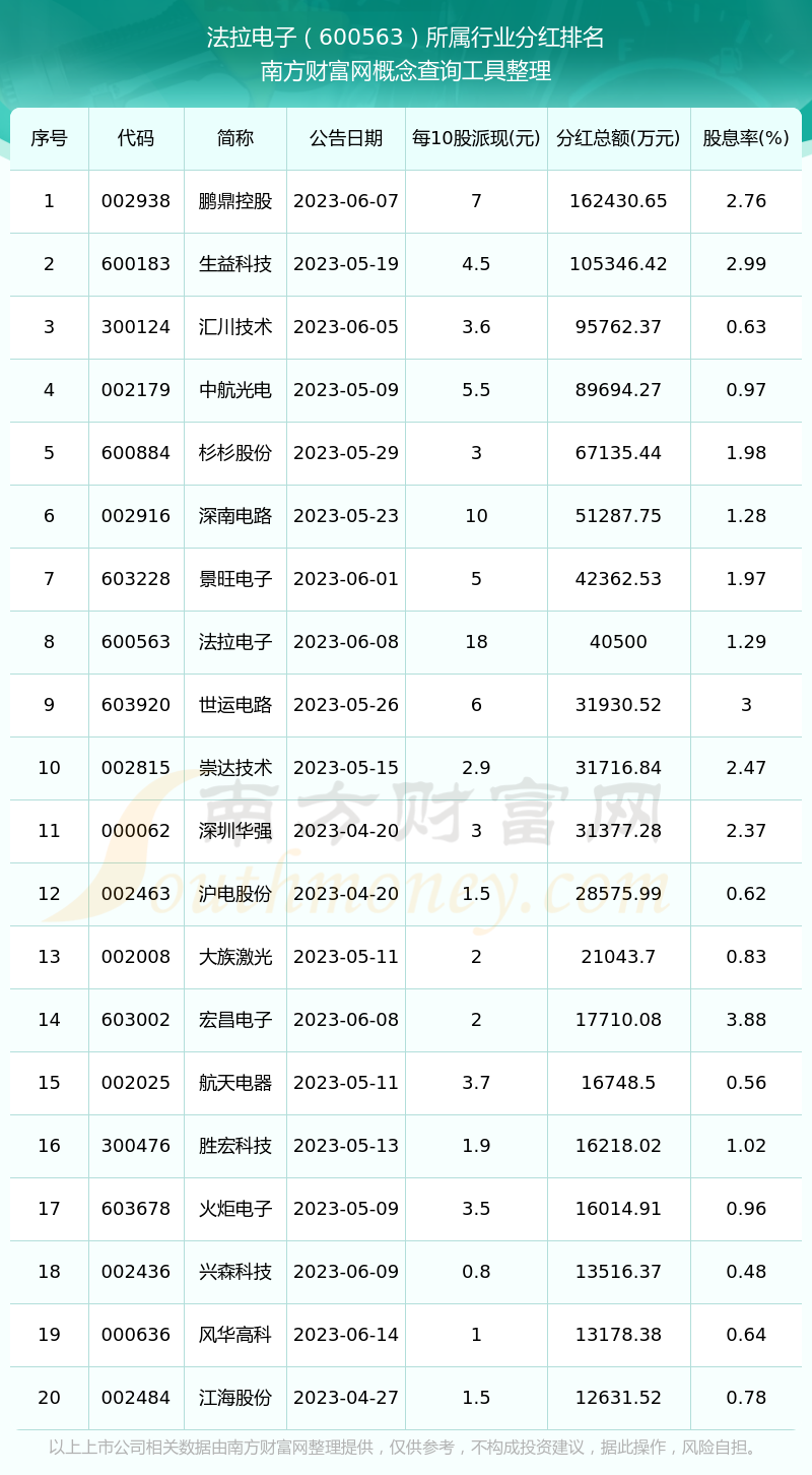 按照南方財富網(wǎng)趨勢選股系統(tǒng)統(tǒng)計,法拉電子所屬行業(yè)為電容器行業(yè),電容器行業(yè)分紅排名情況如下表: