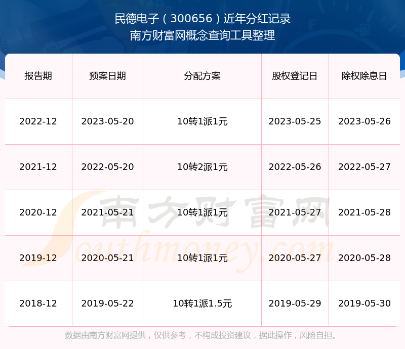 民德電子最新一次公布的分紅方案為10轉1派1元。本次權益分派股權登記日為2023年5月25日,除權除息日為2023年5月26日,派息日為2023年5月26日。