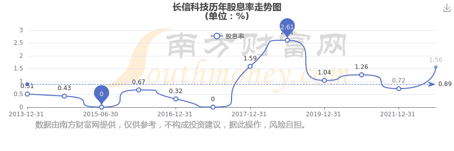 長(zhǎng)信科技?xì)v年股息率走勢(shì)如下圖: