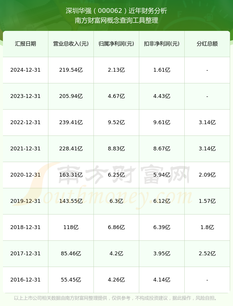 深圳華強(qiáng)2024年總營(yíng)收219.54億,同比增長(zhǎng)6.6%;凈利潤(rùn)2.13億,同比增長(zhǎng)-54.43%;銷(xiāo)售毛利率8.43%。