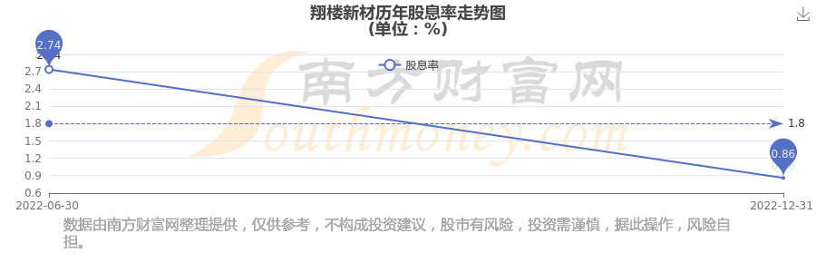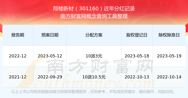 翔樓新材最新一次公布的分紅方案為10派3元。本次權(quán)益分派股權(quán)登記日為2023年5月18日,除權(quán)除息日為2023年5月19日,派息日為2023年5月19日。