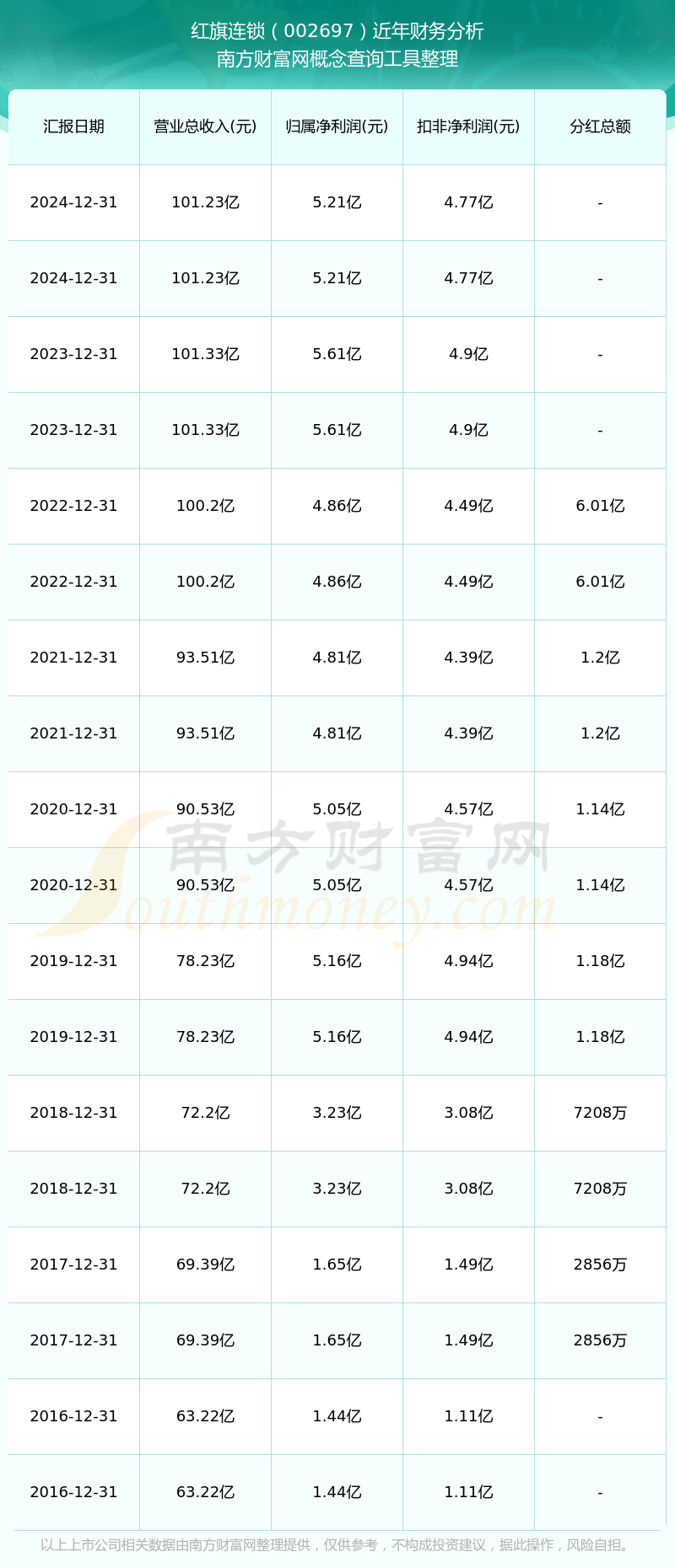 2024年報(bào)顯示,紅旗連鎖實(shí)現(xiàn)營(yíng)收101.23億,同比增長(zhǎng)-0.09%;凈利潤(rùn)5.21億,同比增長(zhǎng)-7.12%;毛利率29.35%。