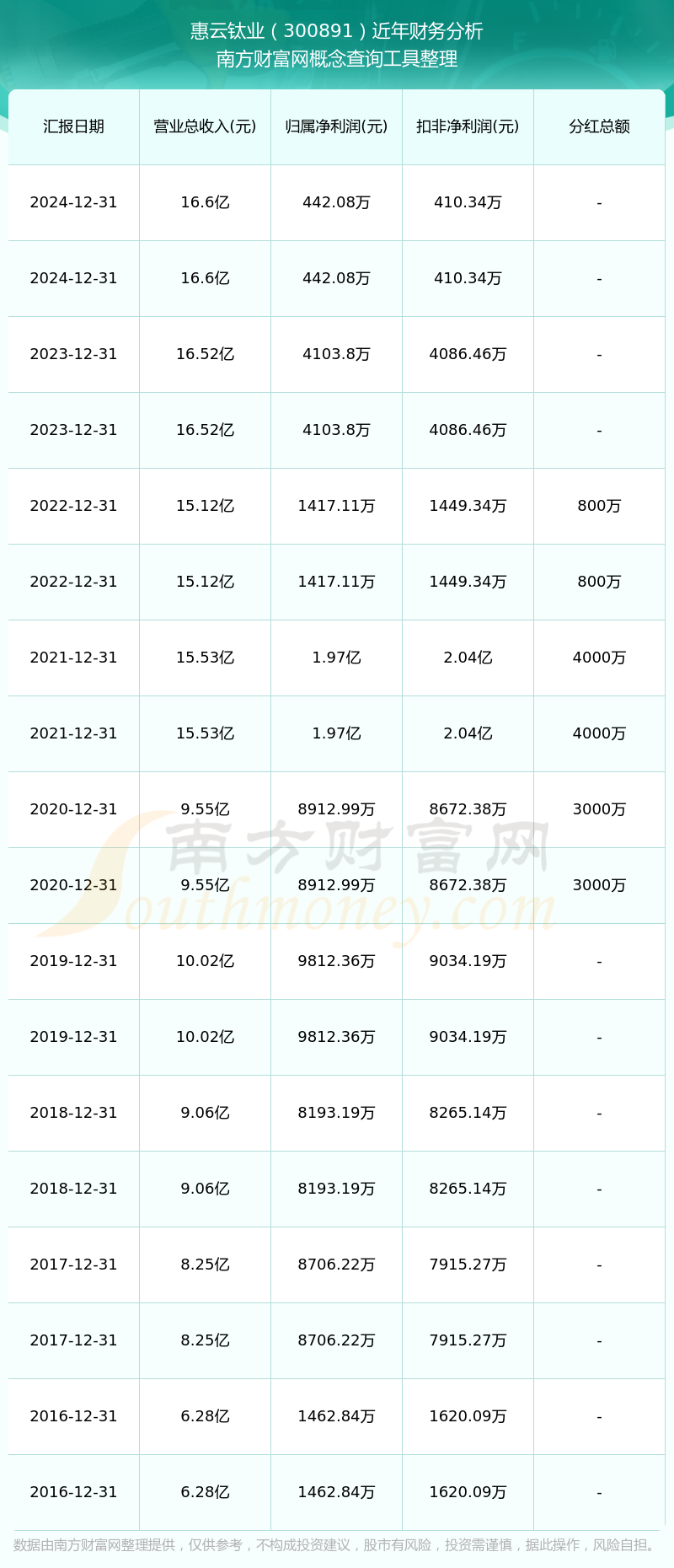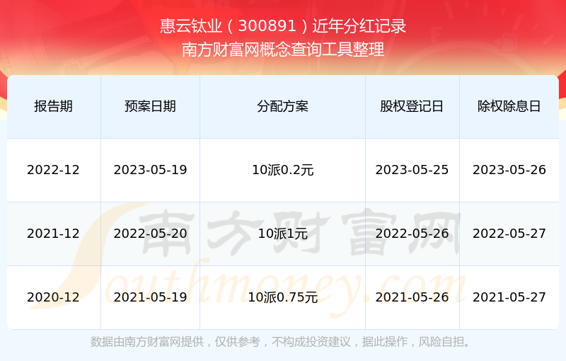 惠云鈦業(yè)歷年分紅派息情況如下表所示: