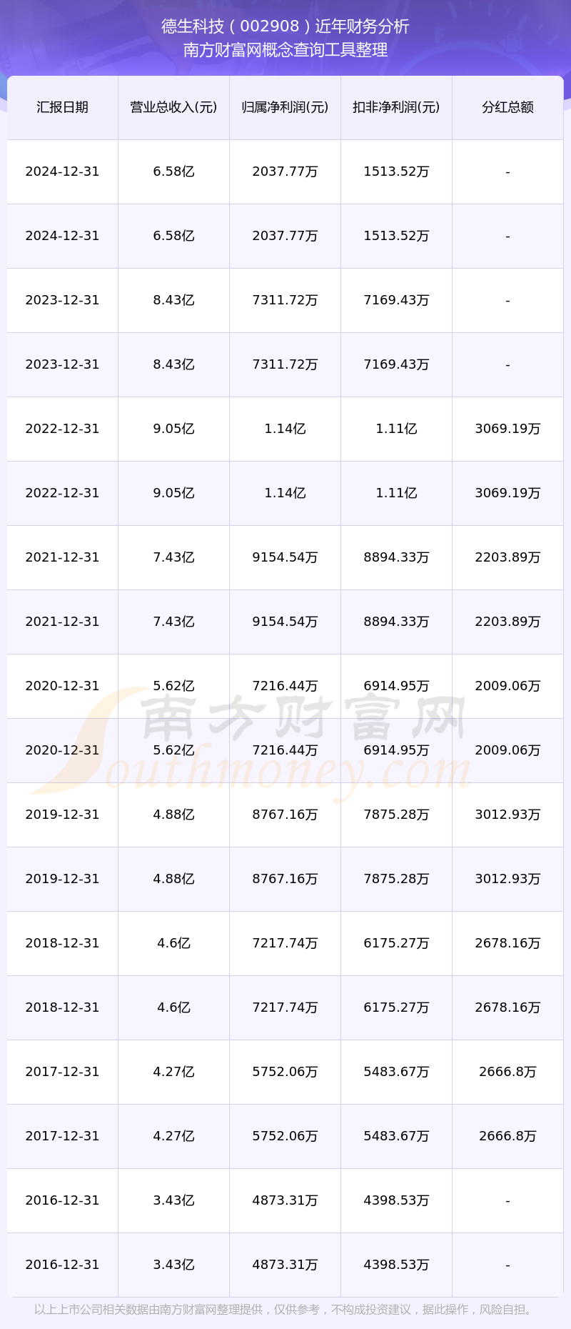 德生科技2024年總營收6.58億,同比增長-21.93%;凈利潤2037.77萬,同比增長-72.13%;銷售毛利率41.56%。