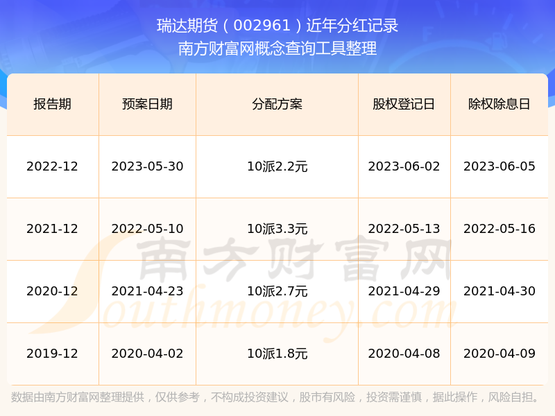 近年瑞達(dá)期貨分紅派息情況如下表所示: