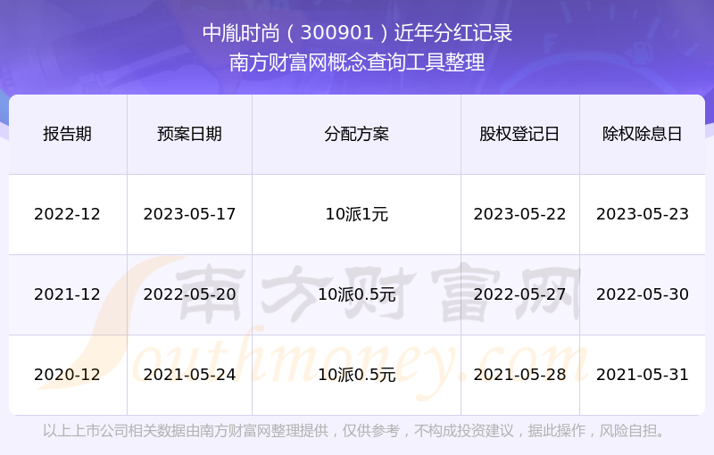 中胤時尚最新一次公布的分紅方案為10派1元。本次權(quán)益分派股權(quán)登記日為2023年5月22日,除權(quán)除息日為2023年5月23日,派息日為2023年5月23日。