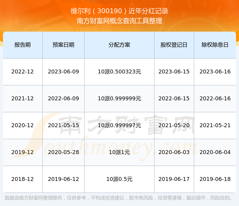 維爾利最新一次公布的分紅方案:10派0.500323元。