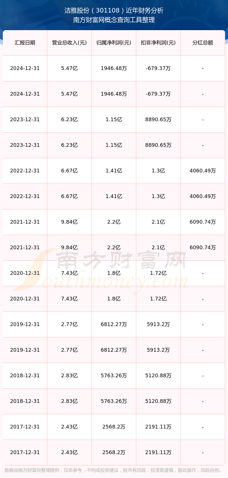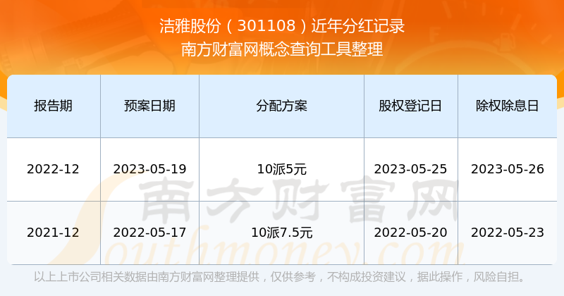 潔雅股份最新一次公布的分紅方案為10派5元。本次權(quán)益分派股權(quán)登記日為2023年5月25日,除權(quán)除息日為2023年5月26日,派息日為2023年5月26日。