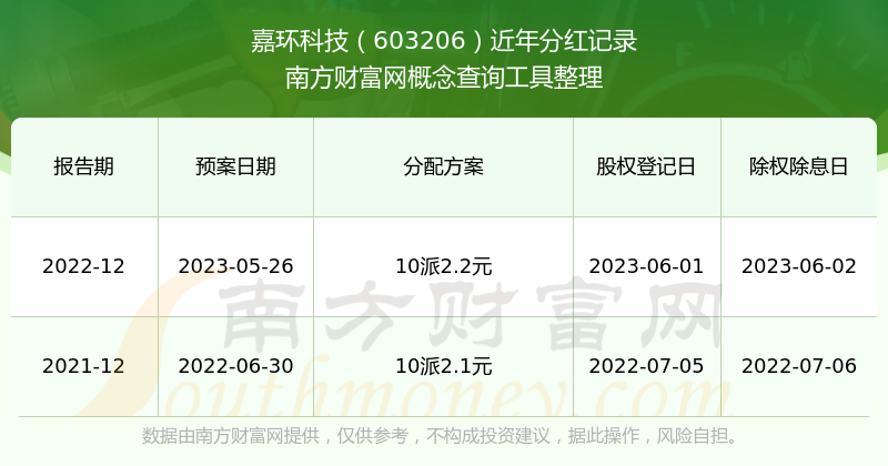 嘉環(huán)科技最新一次公布的分紅方案為10派2.2元。本次權(quán)益分派股權(quán)登記日為2023年6月1日,除權(quán)除息日為2023年6月2日,派息日為2023年6月2日。