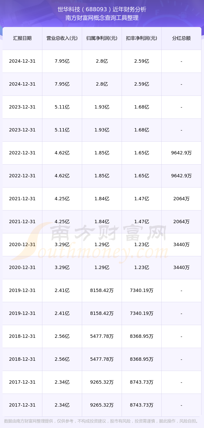 世華科技歷年分紅派息情況如下表所示: