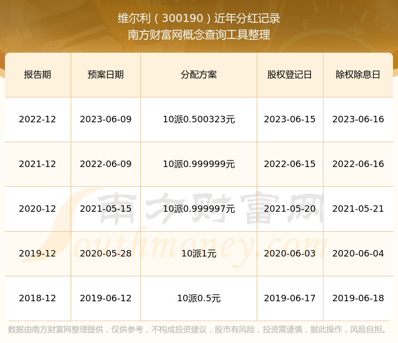 維爾利最新一次公布的分紅方案為10派0.500323元。本次權(quán)益分派股權(quán)登記日為2023年6月15日,除權(quán)除息日為2023年6月16日,派息日為2023年6月16日。