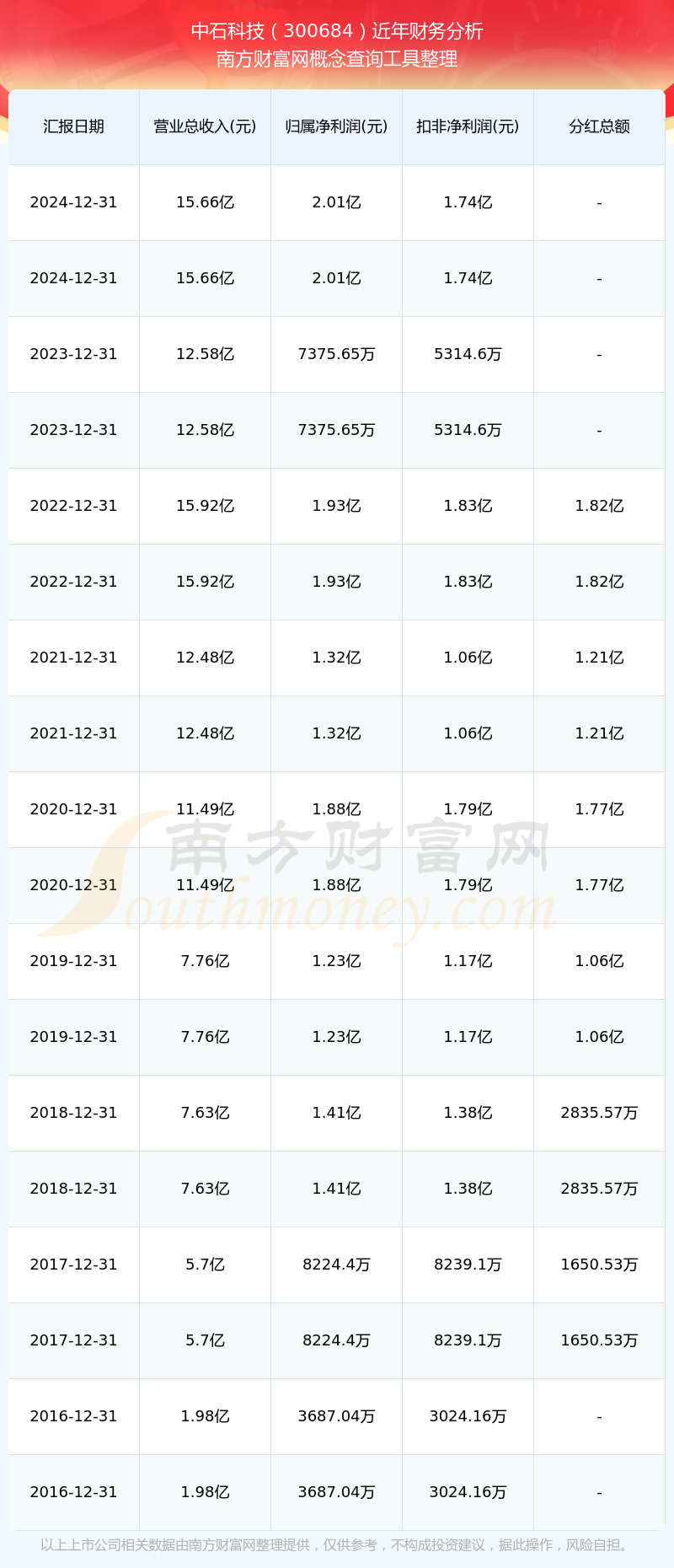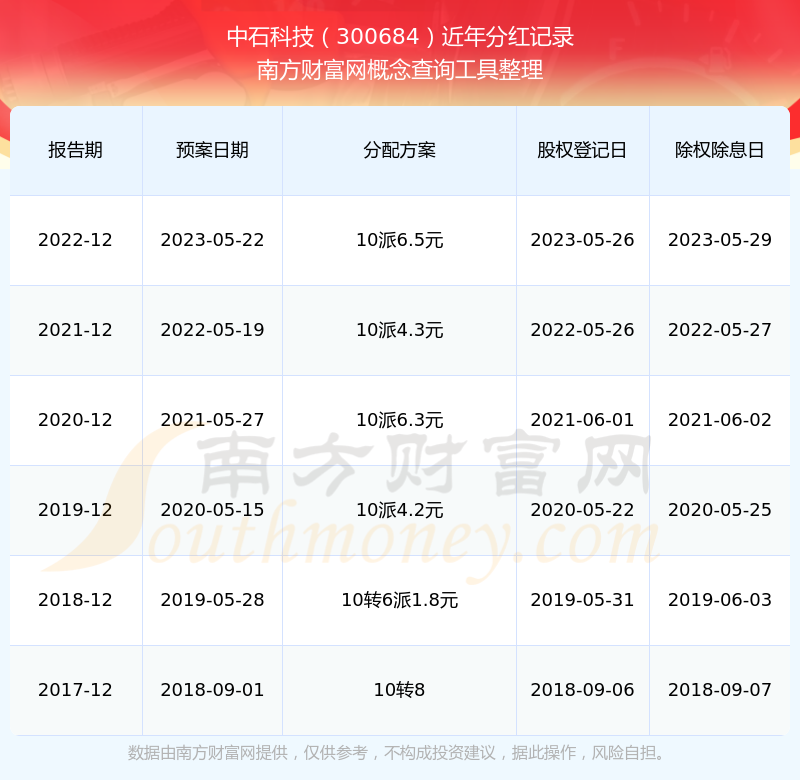 中石科技最新一次公布的分紅方案:10派6.5元。