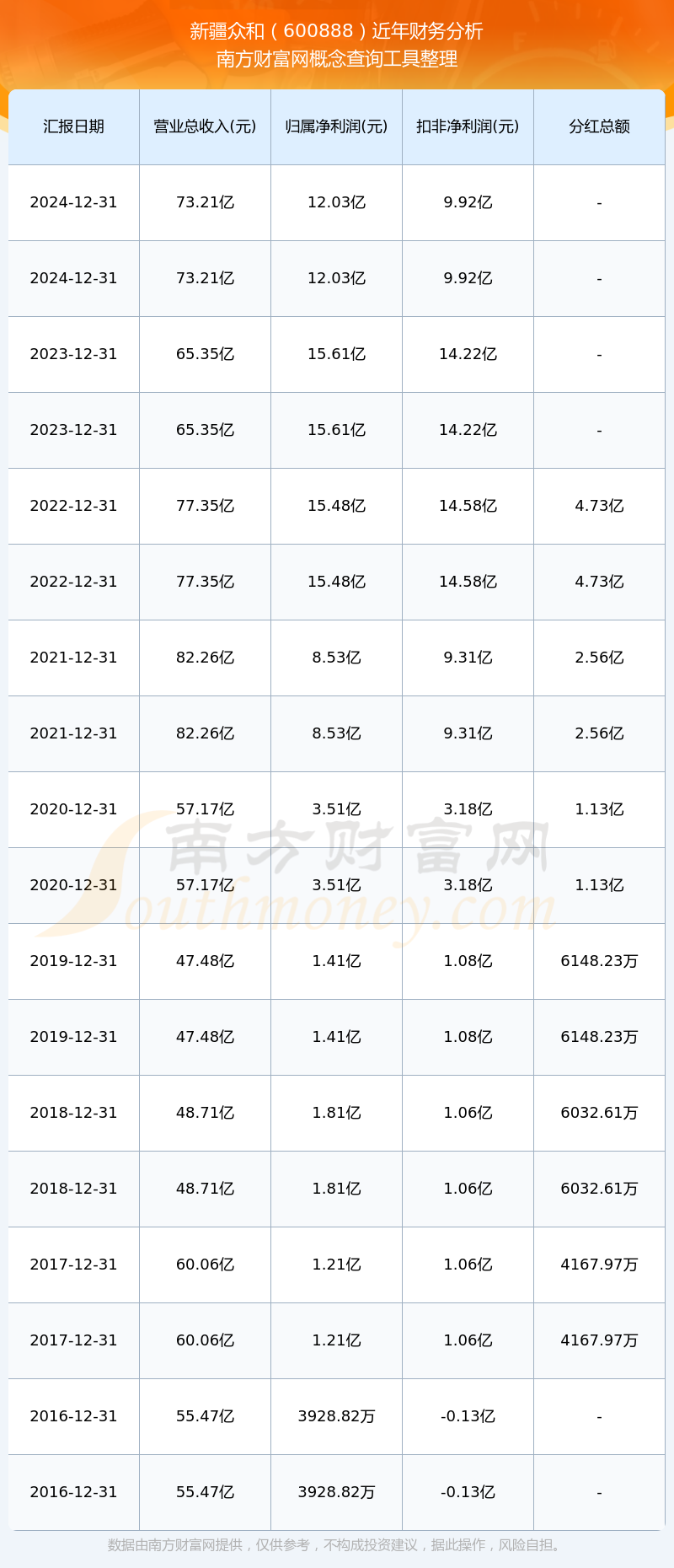 2024年新疆眾和總營收73.21億,同比增長12.03%;凈利潤12.03億,同比增長-22.94%;銷售毛利率10.85%。