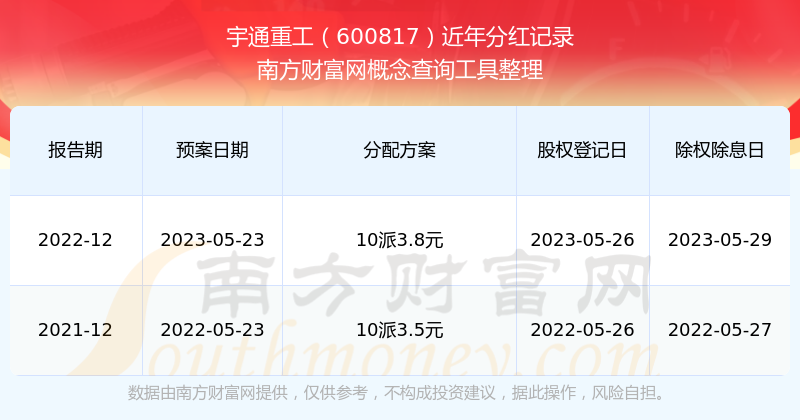宇通重工最新一次公布的分紅方案為10派3.8元。本次權(quán)益分派股權(quán)登記日為2023年5月26日,除權(quán)除息日為2023年5月29日,派息日為2023年5月29日。