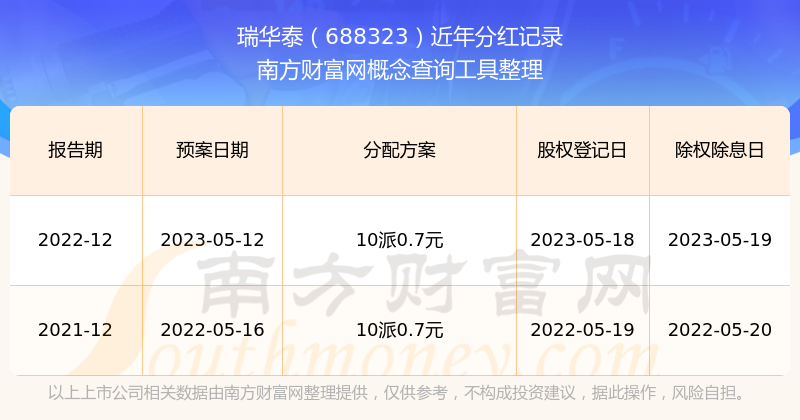 瑞華泰最新一次公布的分紅方案為10派0.7元。本次權(quán)益分派股權(quán)登記日為2023年5月18日,除權(quán)除息日為2023年5月19日,派息日為2023年5月19日。