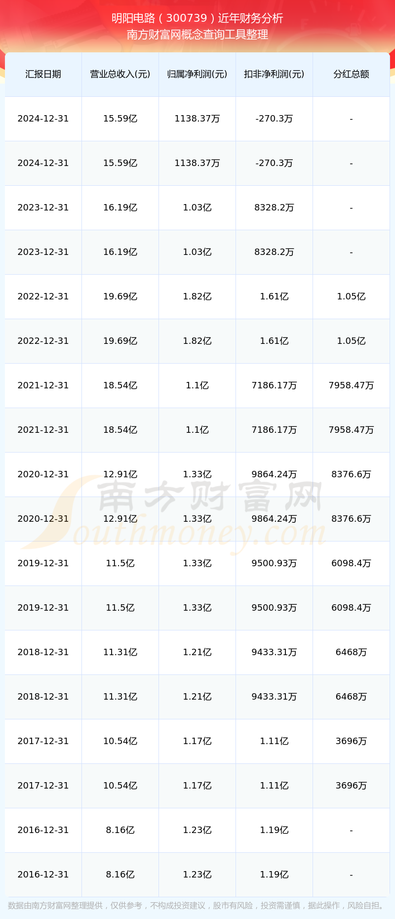 明陽電路公司2024年實現(xiàn)營業(yè)收入15.59億元,同比增長-3.71%;凈利潤1138.37萬元,同比增長-88.91%;毛利率19.68%。
