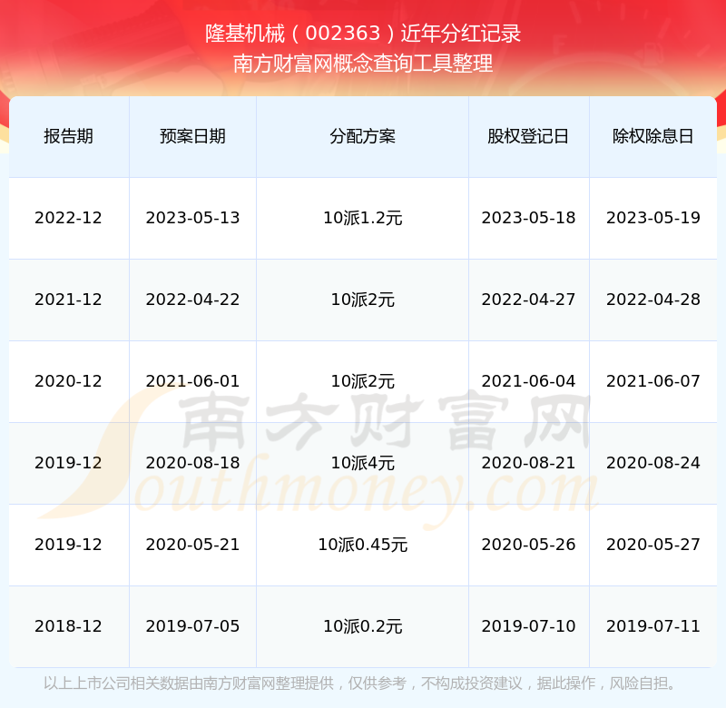 隆基機械最新一次公布的分紅方案:10派1.2元。