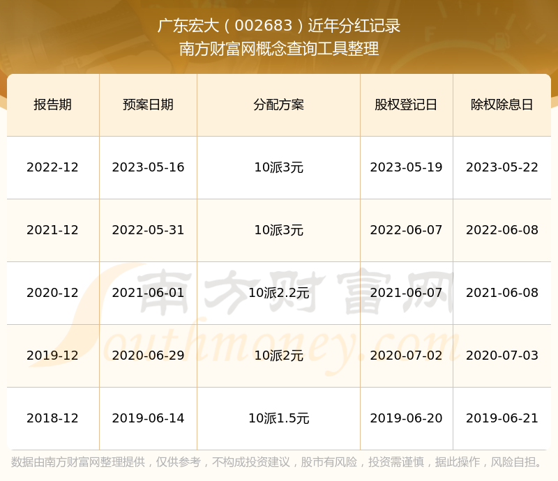 廣東宏大最新一次公布的分紅方案為10派3元。本次權(quán)益分派股權(quán)登記日為2023年5月19日,除權(quán)除息日為2023年5月22日,派息日為2023年5月22日。