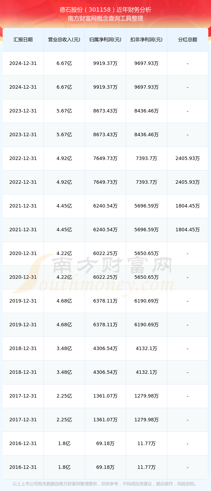 德石股份公司2024年實(shí)現(xiàn)營業(yè)收入6.67億元,同比增長17.68%;凈利潤9919.37萬元,同比增長14.37%;毛利率35.07%。
