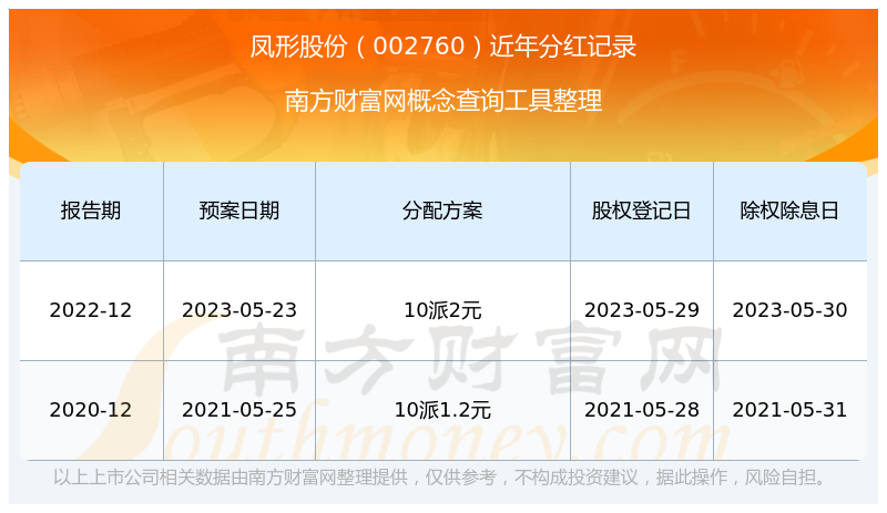 鳳形股份最新一次公布的分紅方案為10派2元。本次權益分派股權登記日為2023年5月29日,除權除息日為2023年5月30日,派息日為2023年5月30日。