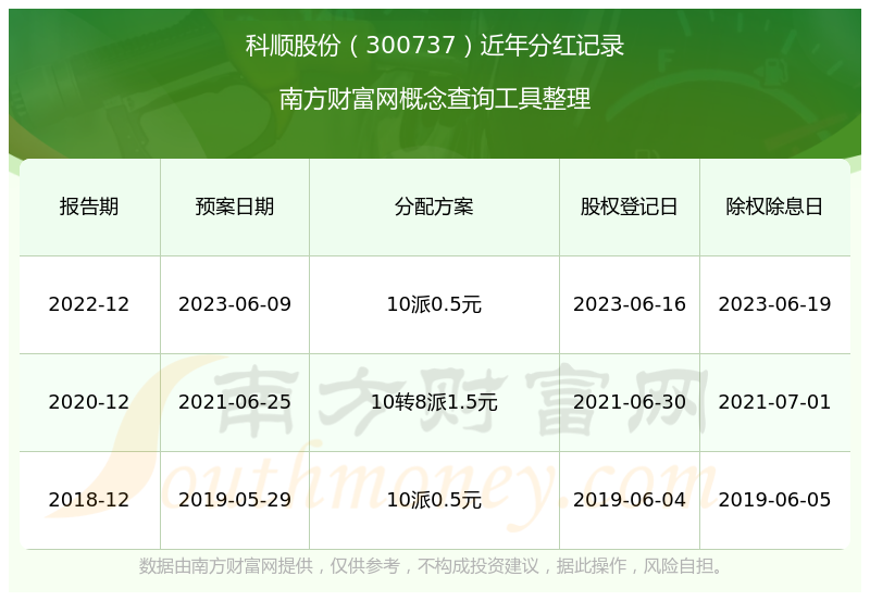 科順股份最新一次公布的分紅方案為10派0.5元。本次權(quán)益分派股權(quán)登記日為2023年6月16日,除權(quán)除息日為2023年6月19日,派息日為2023年6月19日。