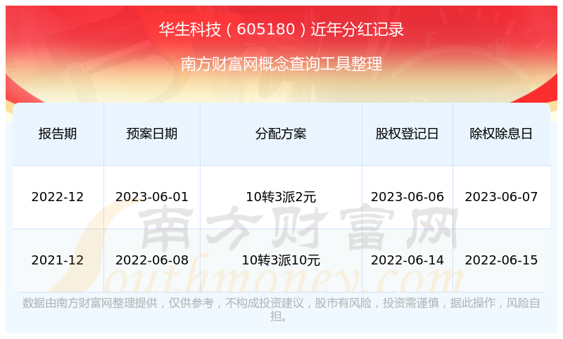 華生科技最新一次公布的分紅方案為10轉(zhuǎn)3派2元。本次權(quán)益分派股權(quán)登記日為2023年6月6日,除權(quán)除息日為2023年6月7日,派息日為2023年6月7日。