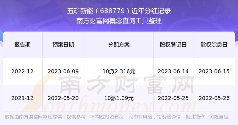五礦新能最新一次公布的分紅方案為10派2.316元。本次權(quán)益分派股權(quán)登記日為2023年6月14日,除權(quán)除息日為2023年6月15日,派息日為2023年6月15日。