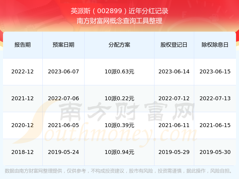 英派斯最新一次公布的分紅方案為10派0.63元。本次權(quán)益分派股權(quán)登記日為2023年6月14日,除權(quán)除息日為2023年6月15日,派息日為2023年6月15日。