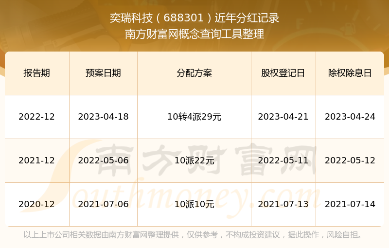 奕瑞科技?xì)v年分紅派息情況如下表所示: