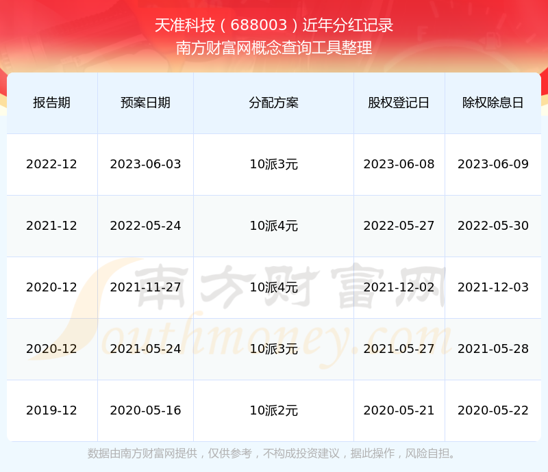 天準(zhǔn)科技最新一次公布的分紅方案為10派3元。本次權(quán)益分派股權(quán)登記日為2023年6月8日,除權(quán)除息日為2023年6月9日,派息日為2023年6月9日。