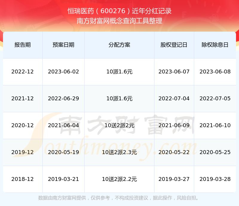 恒瑞醫(yī)藥最新一次公布的分紅方案為10派1.6元。本次權(quán)益分派股權(quán)登記日為2023年6月7日,除權(quán)除息日為2023年6月8日,派息日為2023年6月8日。