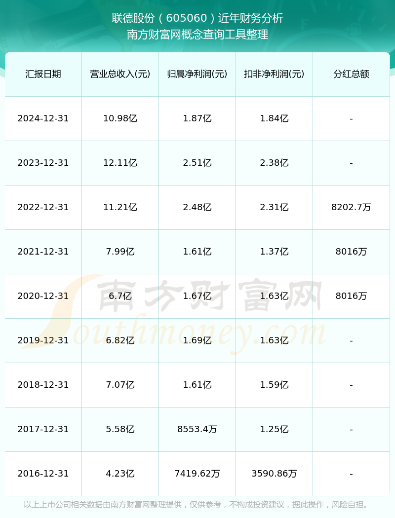 聯(lián)德股份歷年分紅派息情況如下表所示: