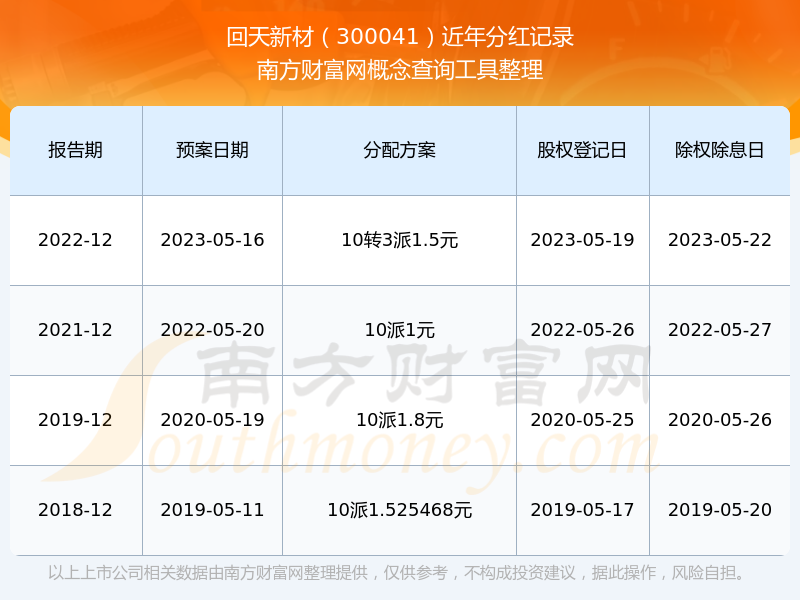 回天新材最新一次公布的分紅方案為10轉(zhuǎn)3派1.5元。本次權(quán)益分派股權(quán)登記日為2023年5月19日,除權(quán)除息日為2023年5月22日,派息日為2023年5月22日。
