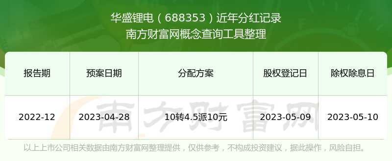 華盛鋰電最新一次公布的分紅方案為10轉(zhuǎn)4.5派10元。本次權(quán)益分派股權(quán)登記日為2023年5月9日,除權(quán)除息日為2023年5月10日,派息日為2023年5月10日。