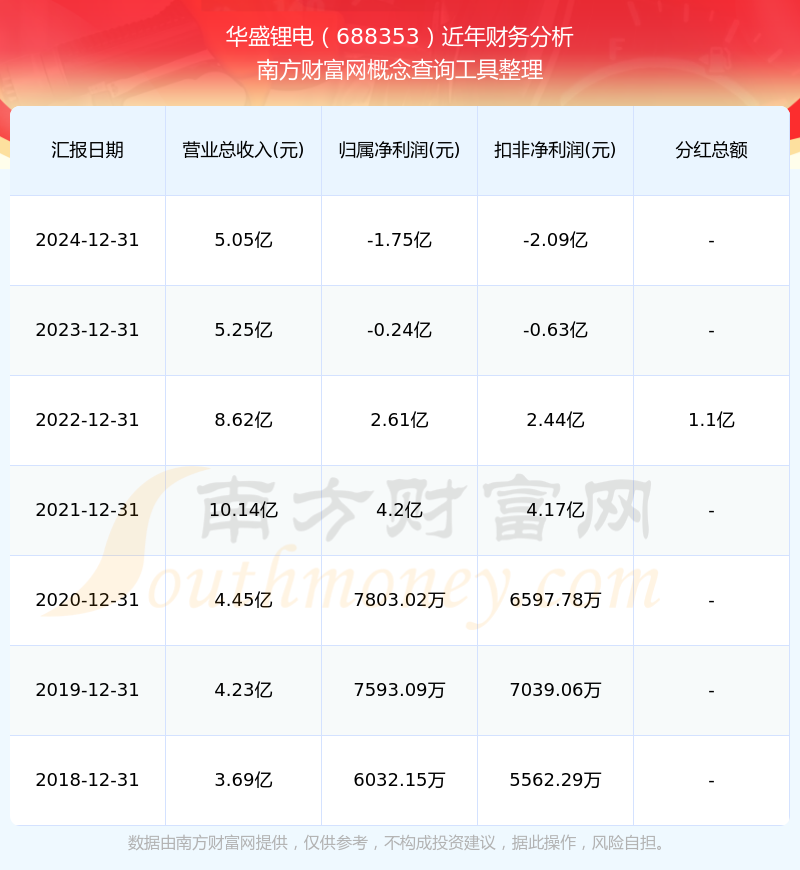 華盛鋰電公司2024年實(shí)現(xiàn)營業(yè)收入5.05億元,同比增長-3.83%;凈利潤-1.75億元,同比增長-630.5%;毛利率-19.41%。
