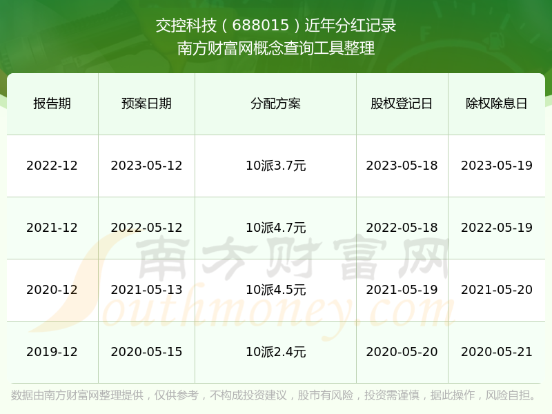 交控科技最新一次公布的分紅方案為10派3.7元。本次權(quán)益分派股權(quán)登記日為2023年5月18日,除權(quán)除息日為2023年5月19日,派息日為2023年5月19日。