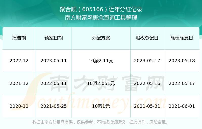 聚合順最新一次公布的分紅方案為10派2.11元。本次權(quán)益分派股權(quán)登記日為2023年5月17日,除權(quán)除息日為2023年5月18日,派息日為2023年5月18日。