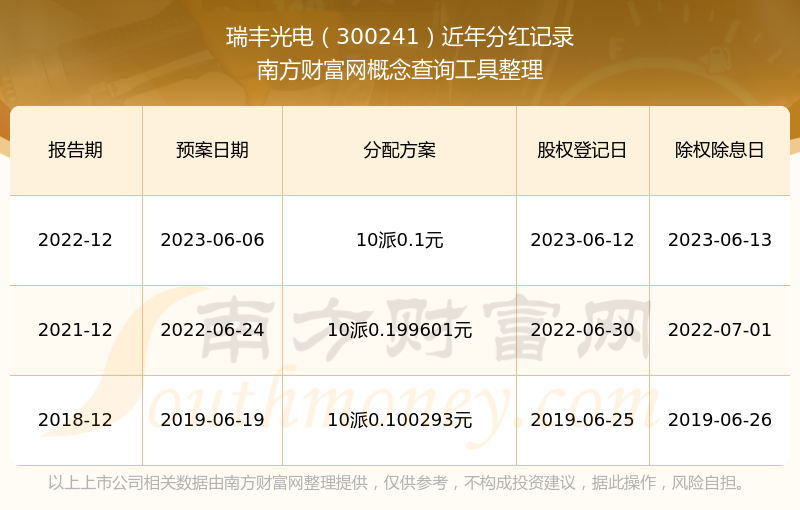 瑞豐光電最新一次公布的分紅方案:10派0.1元。
