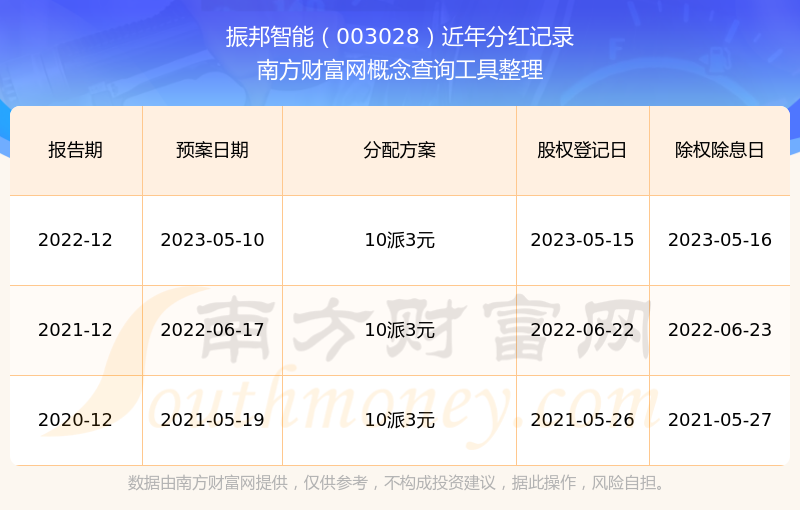 振邦智能最新一次公布的分紅方案為10派3元。本次權(quán)益分派股權(quán)登記日為2023年5月15日,除權(quán)除息日為2023年5月16日,派息日為2023年5月16日。
