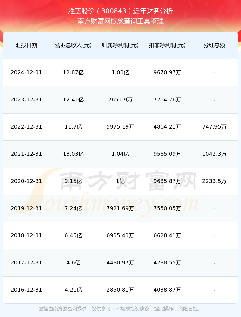 勝藍(lán)股份歷年分紅派息情況如下表所示:
