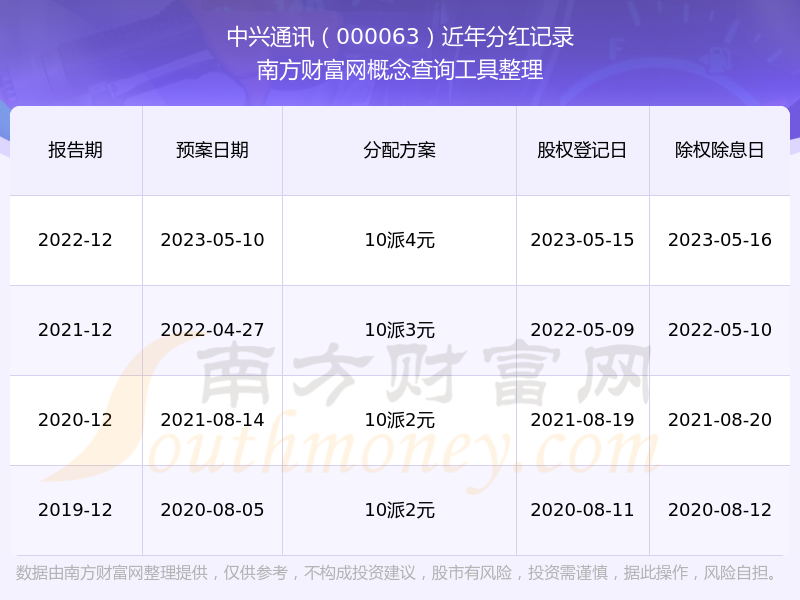 中興通訊最新一次公布的分紅方案為10派4元。本次權(quán)益分派股權(quán)登記日為2023年5月15日,除權(quán)除息日為2023年5月16日,派息日為2023年5月16日。