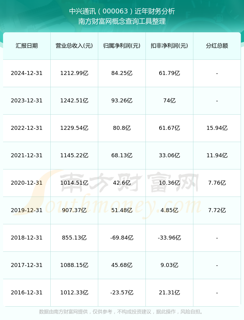 中興通訊2024年總營收1212.99億,同比增長-2.38%;凈利潤84.25億,同比增長-9.66%;銷售毛利率37.91%。