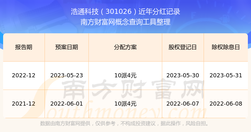 浩通科技最新一次公布的分紅方案為10派4元。本次權益分派股權登記日為2023年5月30日,除權除息日為2023年5月31日,派息日為2023年5月31日。