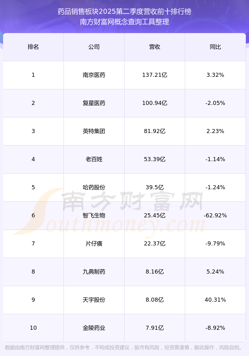 按照南方財(cái)富網(wǎng)概念查詢工具統(tǒng)計(jì),該股所屬板塊為藥品銷售板塊,該板塊共有18只股票,百奧泰2025第二季度營收在該板塊中排名為第18名,該板塊2025第二季度營收排名前十的股票如下表: