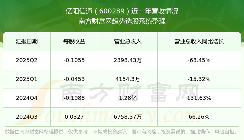 在2025年第二季度,億陽信通的業(yè)績表現(xiàn),主營業(yè)務收入達到2398.43萬元,實現(xiàn)了-68.45%的同比增長率。同時,公司歸母凈利潤錄得-6655.3萬元,同比增長-394.35%。
