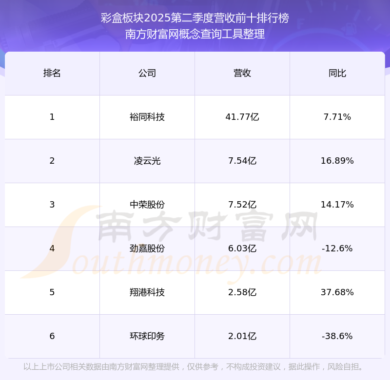 按照南方財(cái)富網(wǎng)概念查詢工具統(tǒng)計(jì),該股所屬板塊為彩盒板塊,該板塊共有6只股票,翔港科技2025第二季度營(yíng)收在該板塊中排名為第5名,該板塊2025第二季度營(yíng)收排名前十的股票如下表: