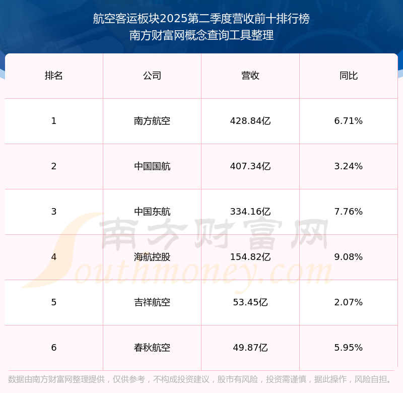 按照南方財富網(wǎng)概念查詢工具統(tǒng)計,該股所屬板塊為航空客運板塊,該板塊共有6只股票,春秋航空2025第二季度營收在該板塊中排名為第6名,該板塊2025第二季度營收排名前十的股票如下表: