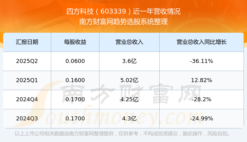 四方科技(603339)披露2025年第二季度報告,報告期實現(xiàn)營收3.6億元,同比-36.11%;歸母凈利潤2040.61萬元,同比-74.82%;扣非凈利潤1752.21萬元,同比-75.47%;基本每股收益0.06元。