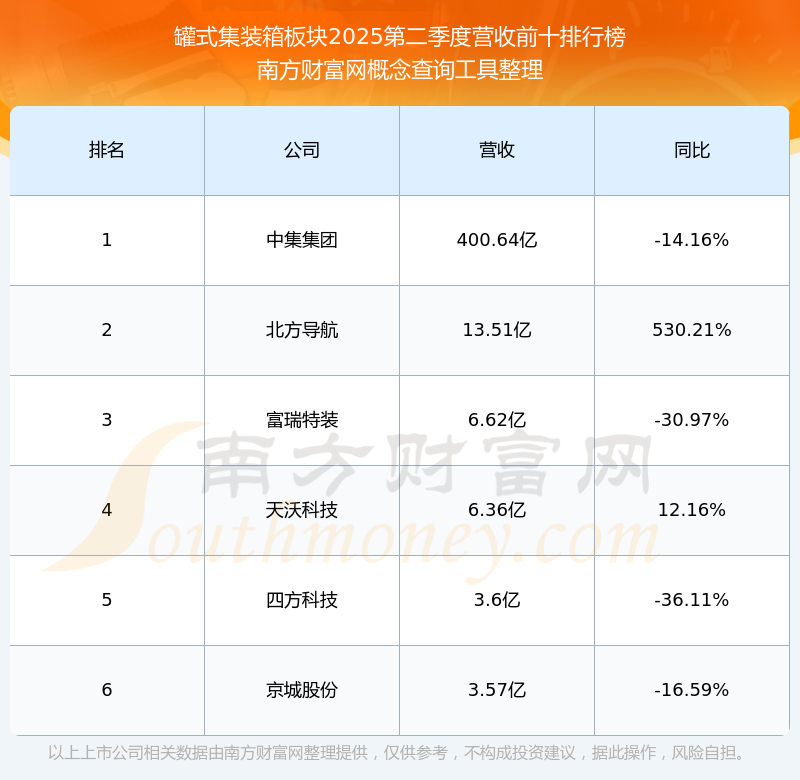 按照南方財富網(wǎng)概念查詢工具統(tǒng)計,該股所屬板塊為罐式集裝箱板塊,該板塊共有6只股票,四方科技2025第二季度營收在該板塊中排名為第5名,該板塊2025第二季度營收排名前十的股票如下表: