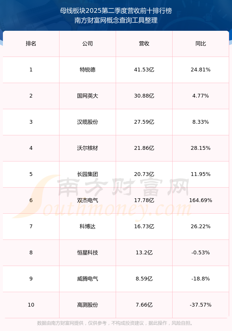 按照南方財富網(wǎng)概念查詢工具統(tǒng)計,該股所屬板塊為母線板塊,該板塊共有14只股票,威騰電氣2025第二季度營收在該板塊中排名為第9名,該板塊2025第二季度營收排名前十的股票如下表: